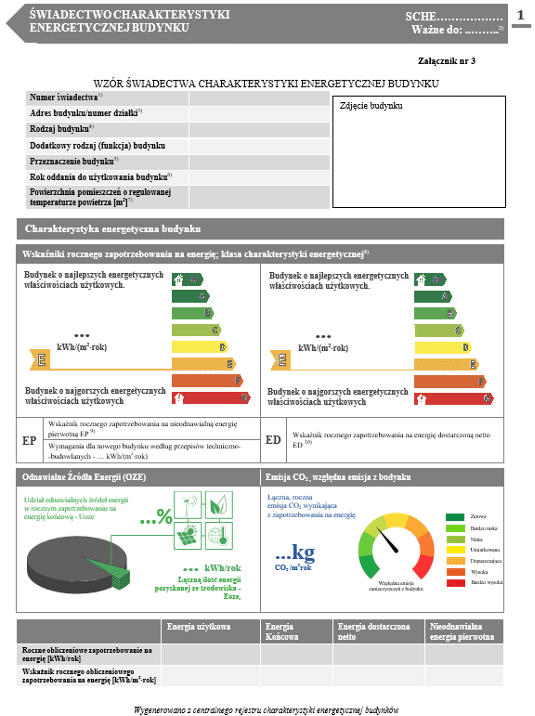 - Nowy sposób prezentacji danych na świadectwie – na pierwszej stronie znajdą się: EP, ED, udział OZE, emisje CO₂ – przedstawione graficznie i kolorystycznie.